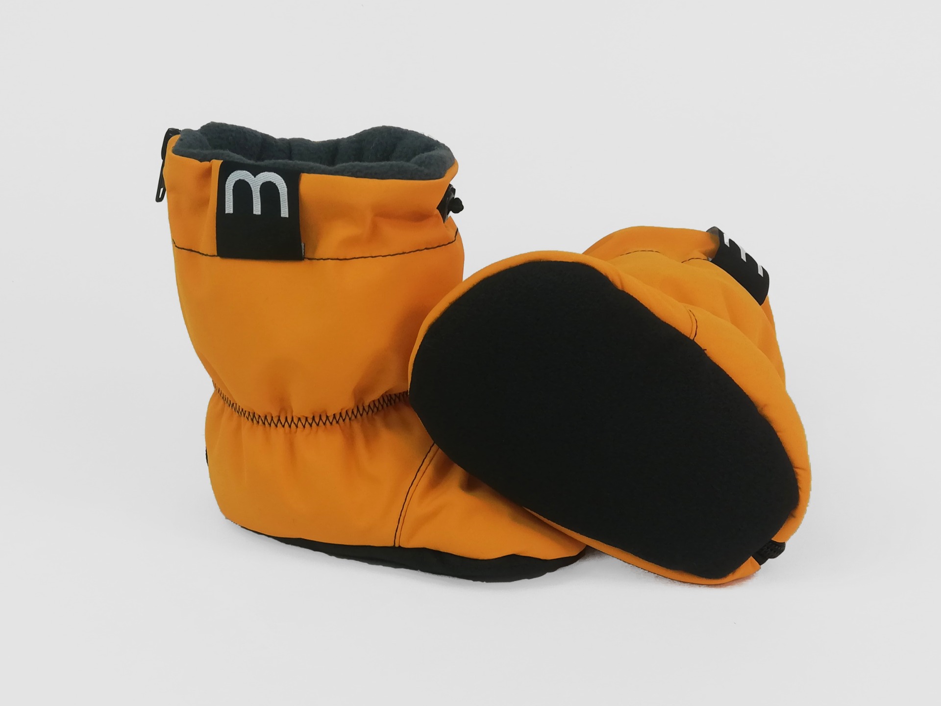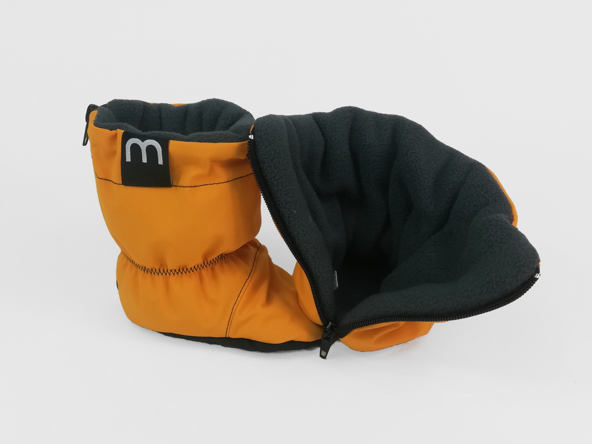Od patičky až nahoru všitý zip, díky kterému se botičky snadno nazouvají. Nad kotníčkem je všitá gumička aby capáčky nepadaly. Nahoře je možnost stáhnout kulatou gumičkou s brzdou.