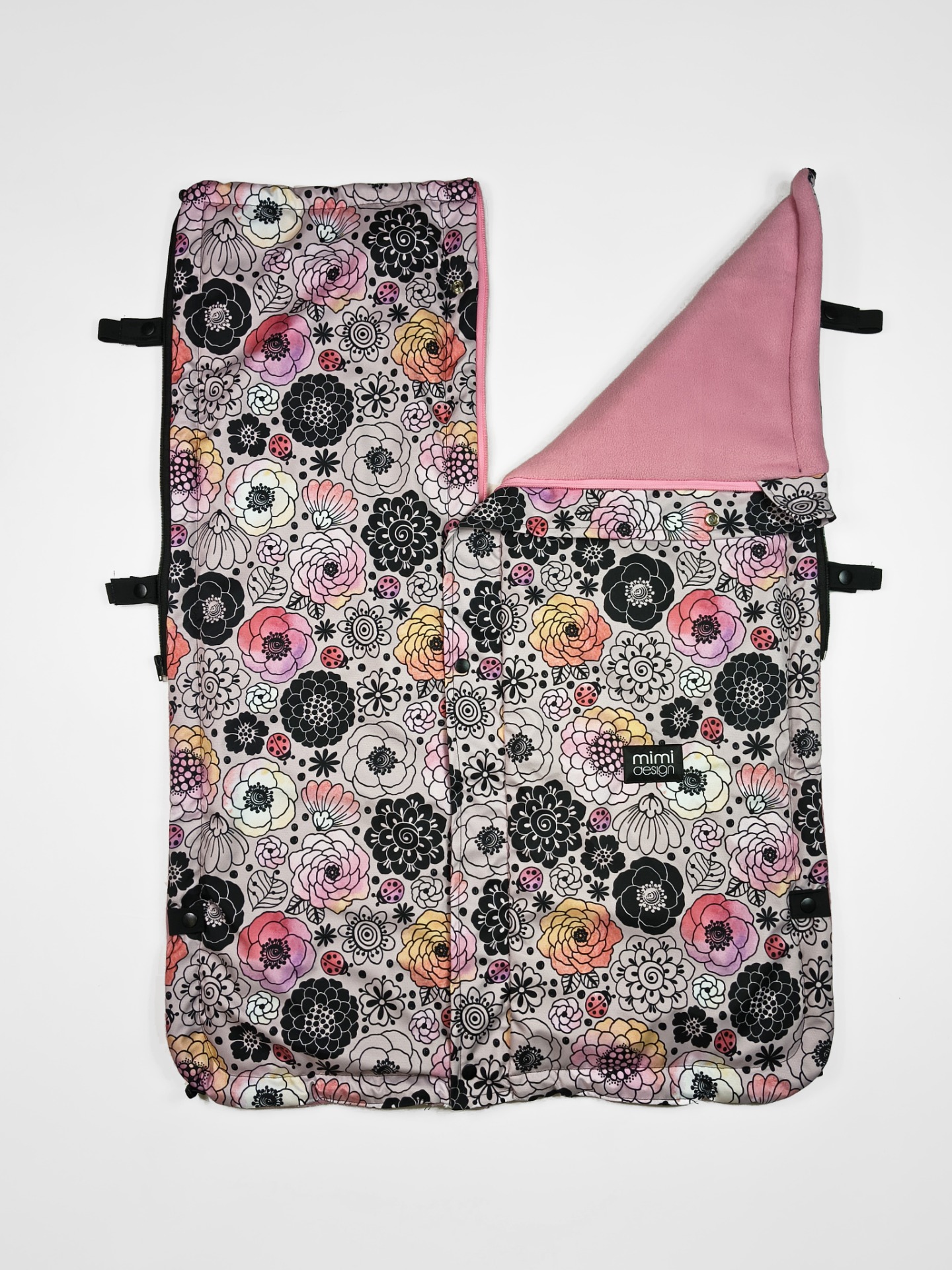 V horní části deky jsou na každé straně také všité dvě gumičky, které můžete snadno připnout ke konstrukci kočárku pomocí druku. Deku tak lze použít i bez podložky se zipy na bocích.