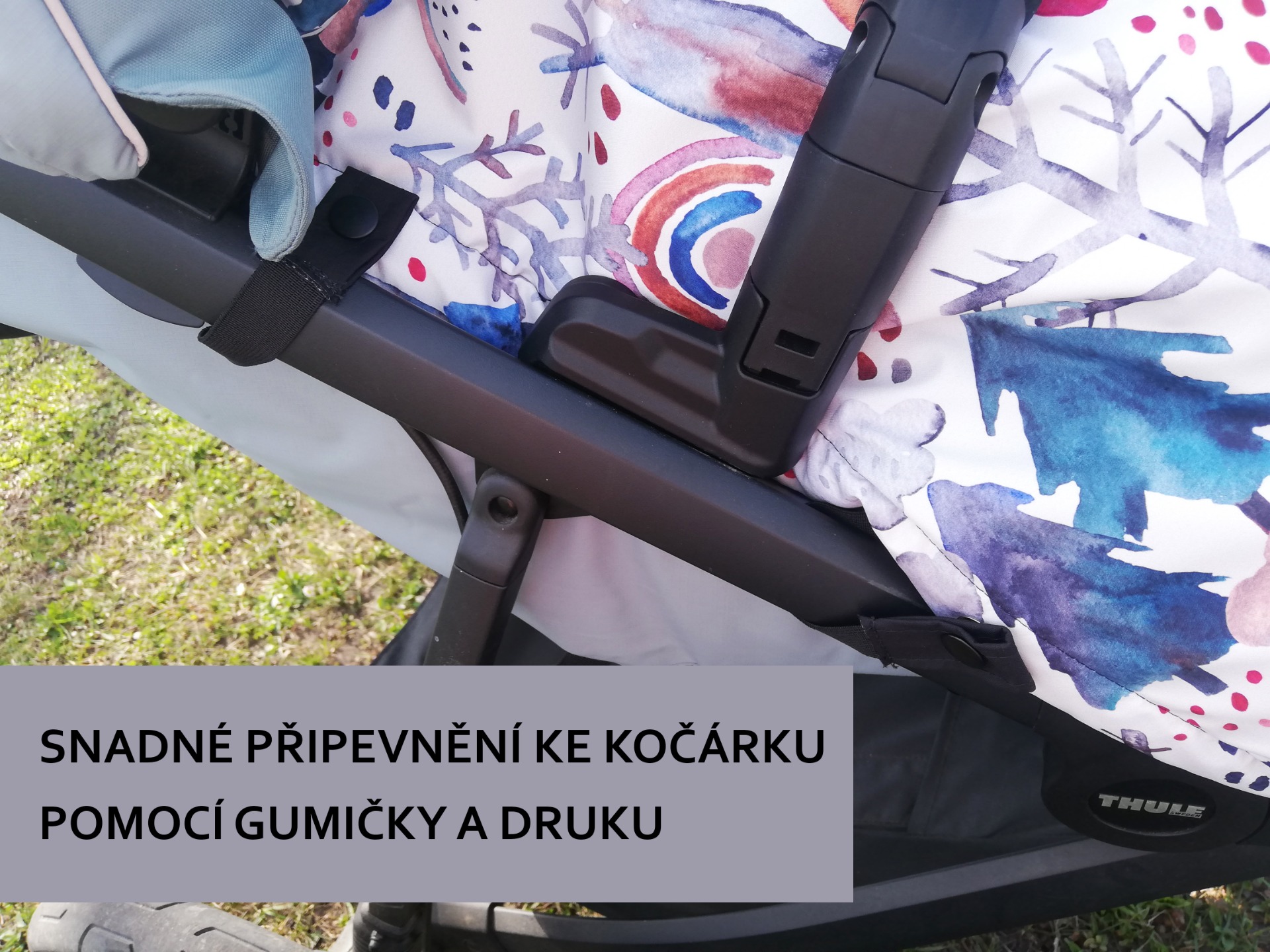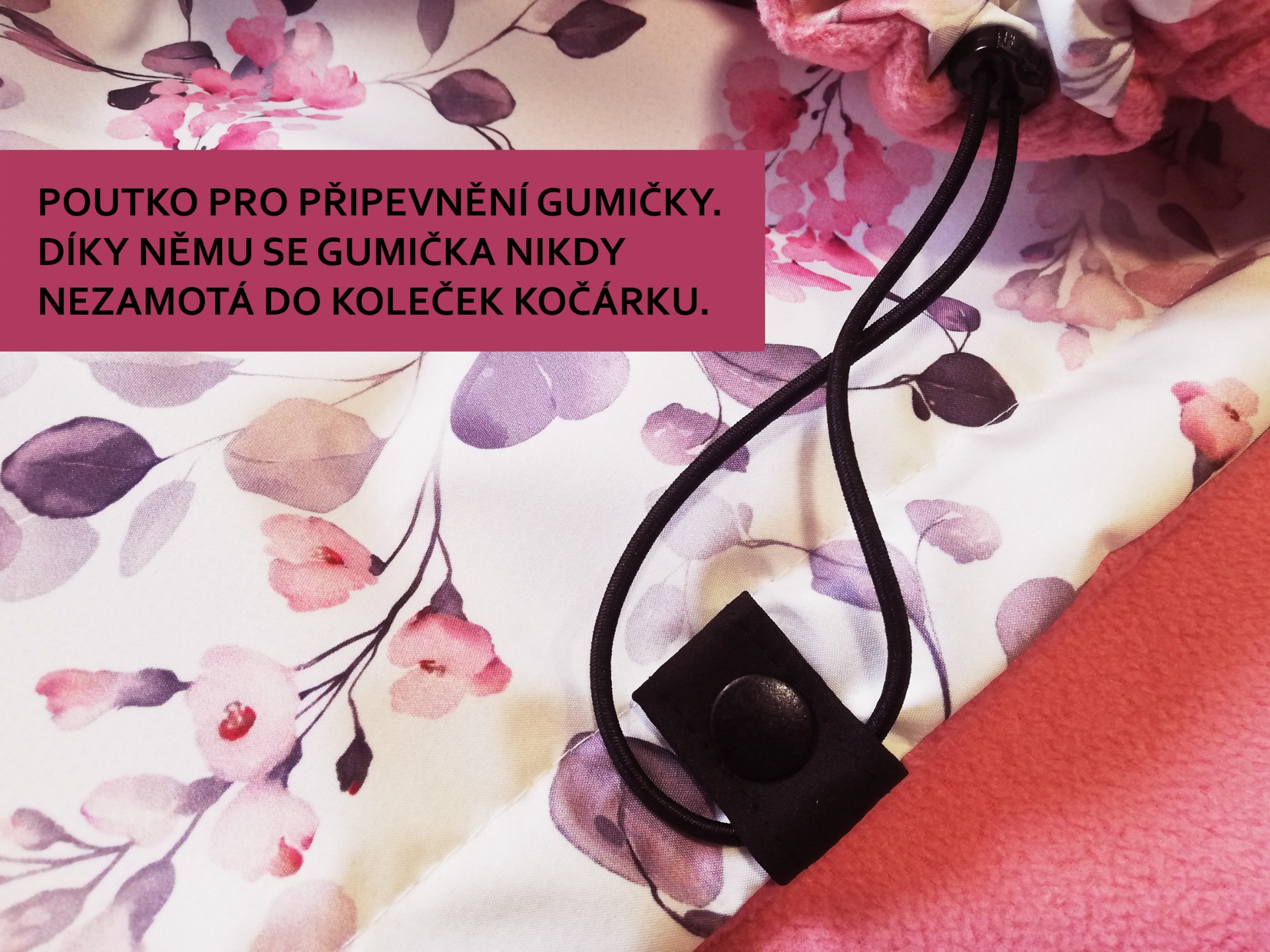 V horní části deky jsou na každé straně také všité dvě gumičky, které můžete snadno připnout ke konstrukci kočárku pomocí druku. Deku tak lze použít i bez podložky se zipy na bocích.