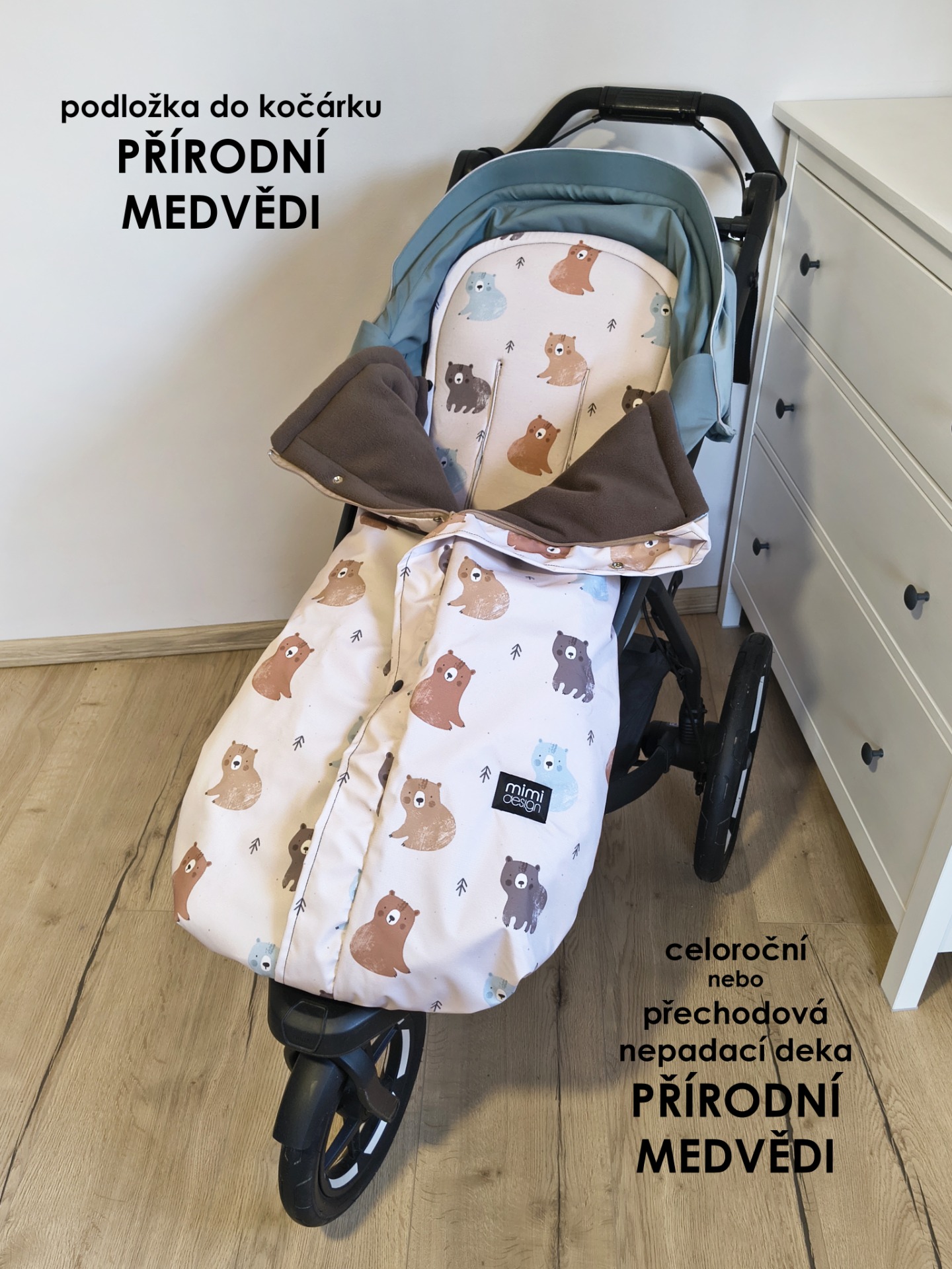Deka má také v horní části všité gumičky s brzdičkou. Jejich utažením tak deku nahoře zmenšíte a děťátko tak můžete více zachumlat pokud zrovna fouká, prší nebo je větší zima.
