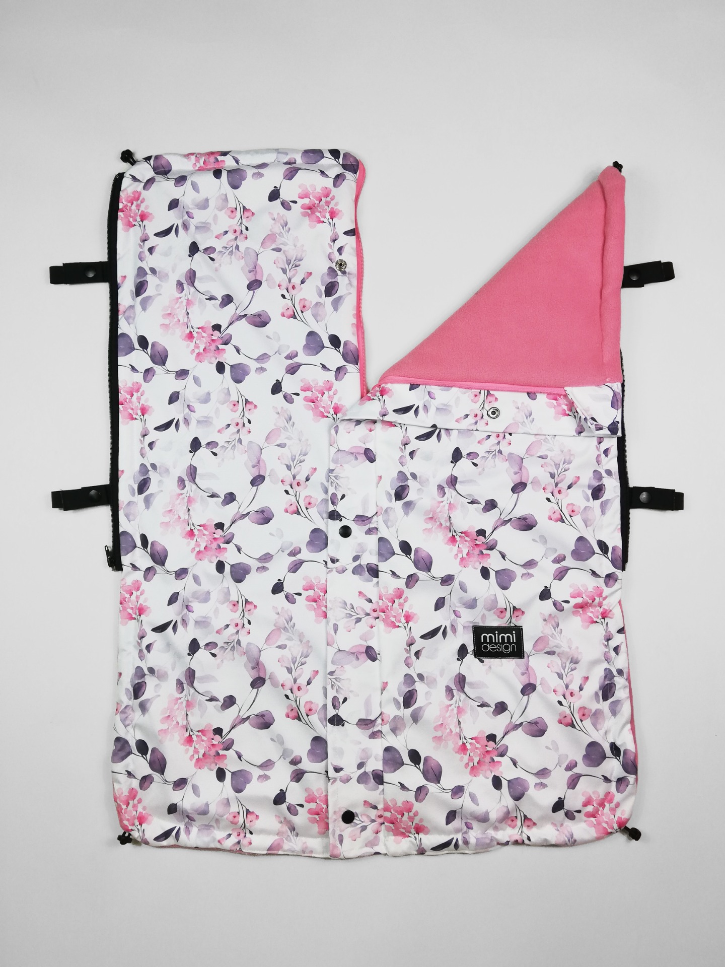 V horní části deky jsou na každé straně také všité dvě gumičky, které můžete snadno připnout ke konstrukci kočárku pomocí druku. Deku tak lze použít i bez podložky se zipy na bocích.