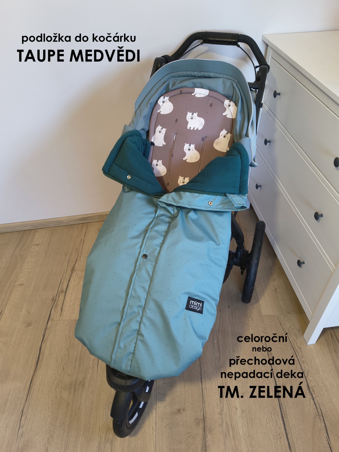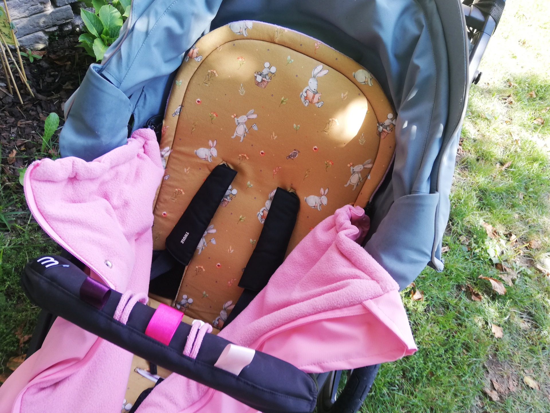 Deka má také v horní části všité gumičky s brzdičkou. Jejich utažením tak deku nahoře zmenšíte a děťátko tak můžete více zachumlat pokud zrovna fouká, prší nebo je větší zima.