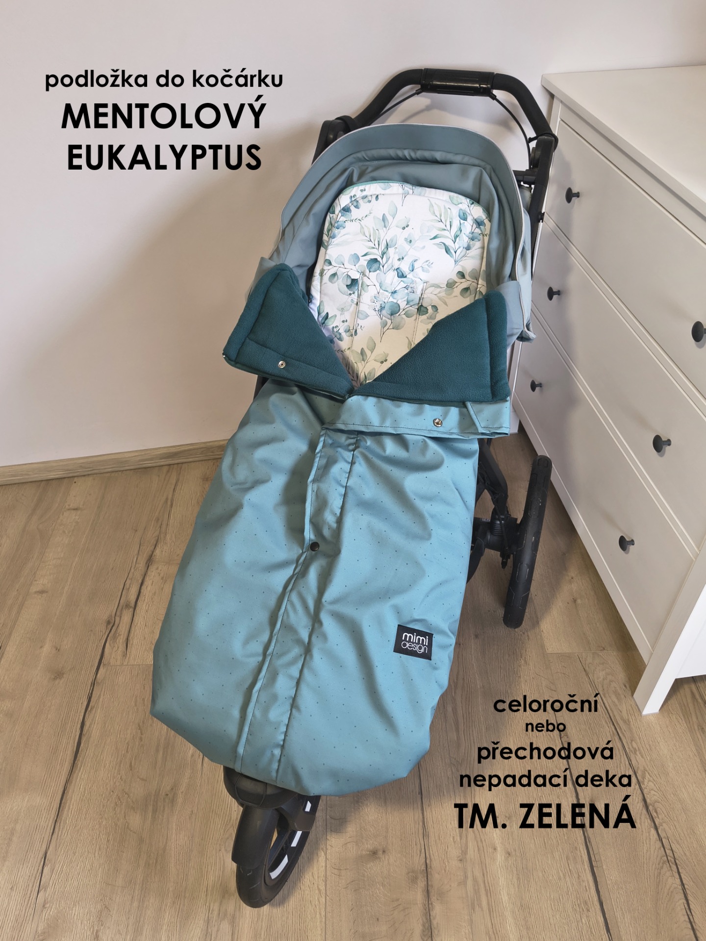 V horní části deky jsou na každé straně také všité dvě gumičky, které můžete snadno připnout ke konstrukci kočárku pomocí druku. Deku tak lze použít i bez podložky se zipy na bocích.