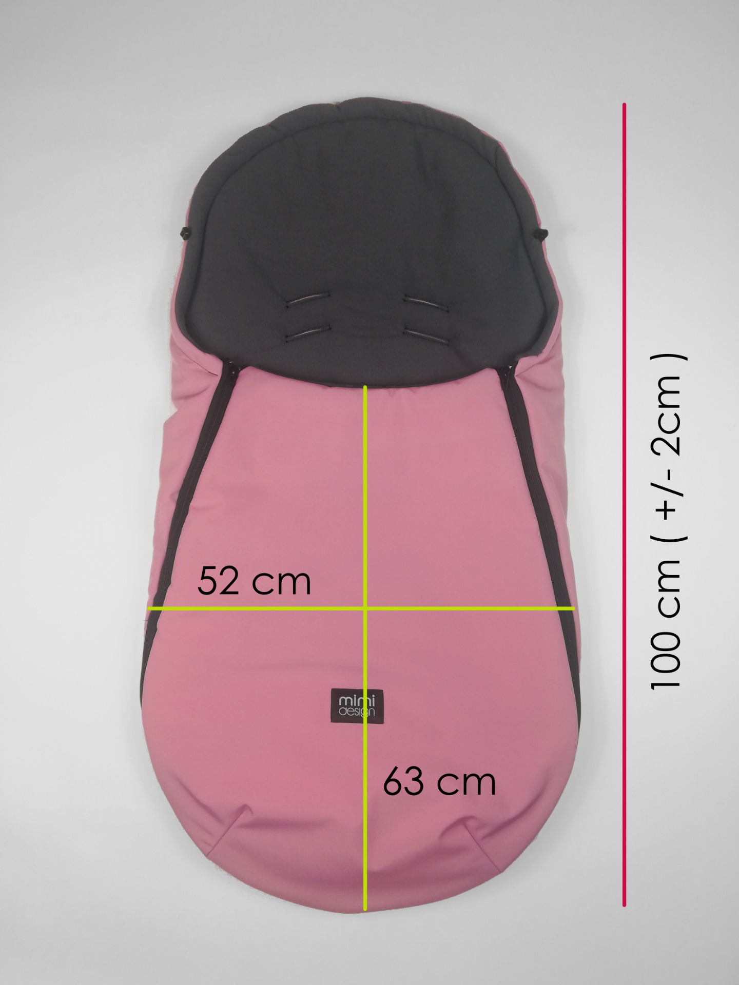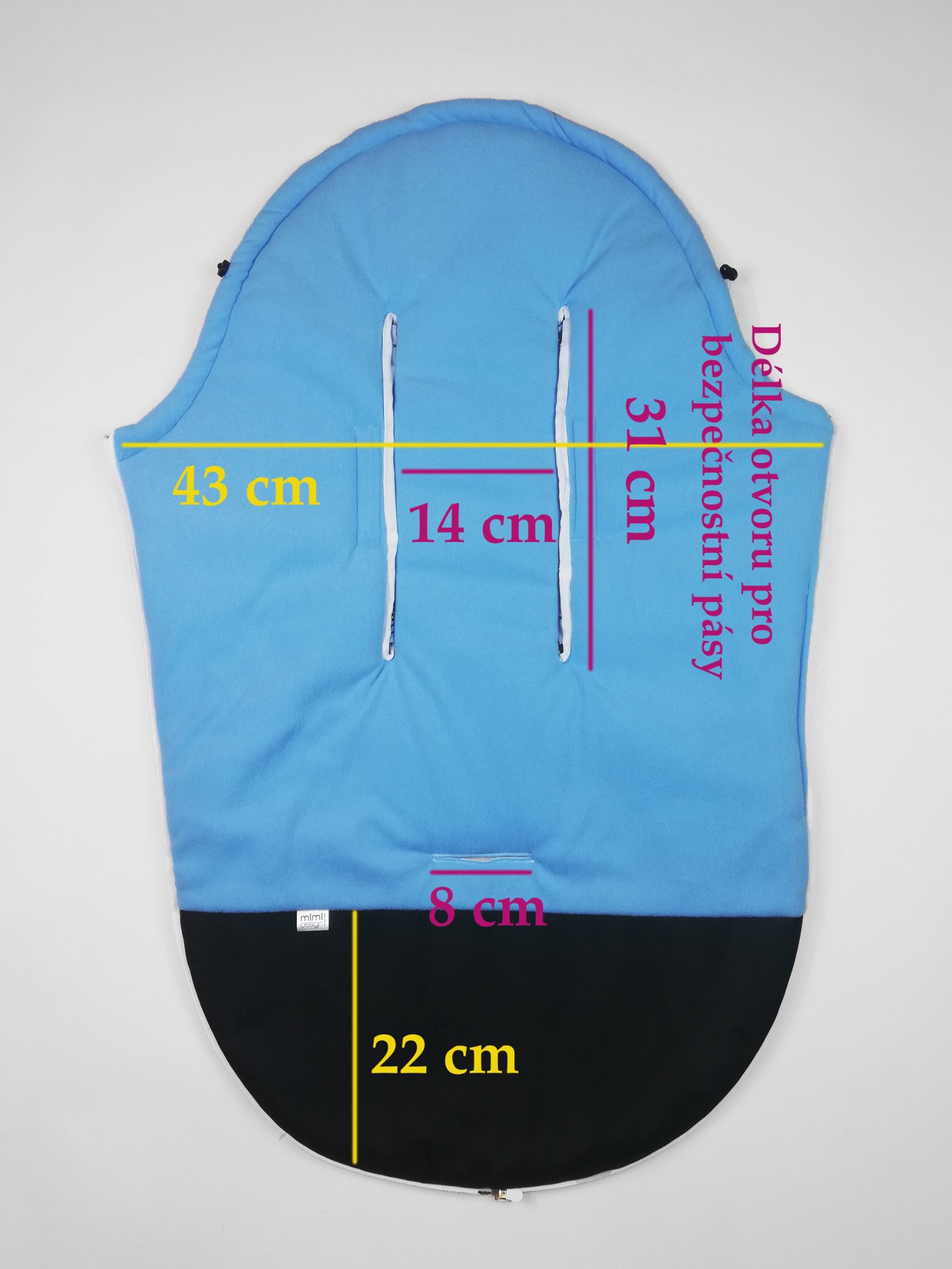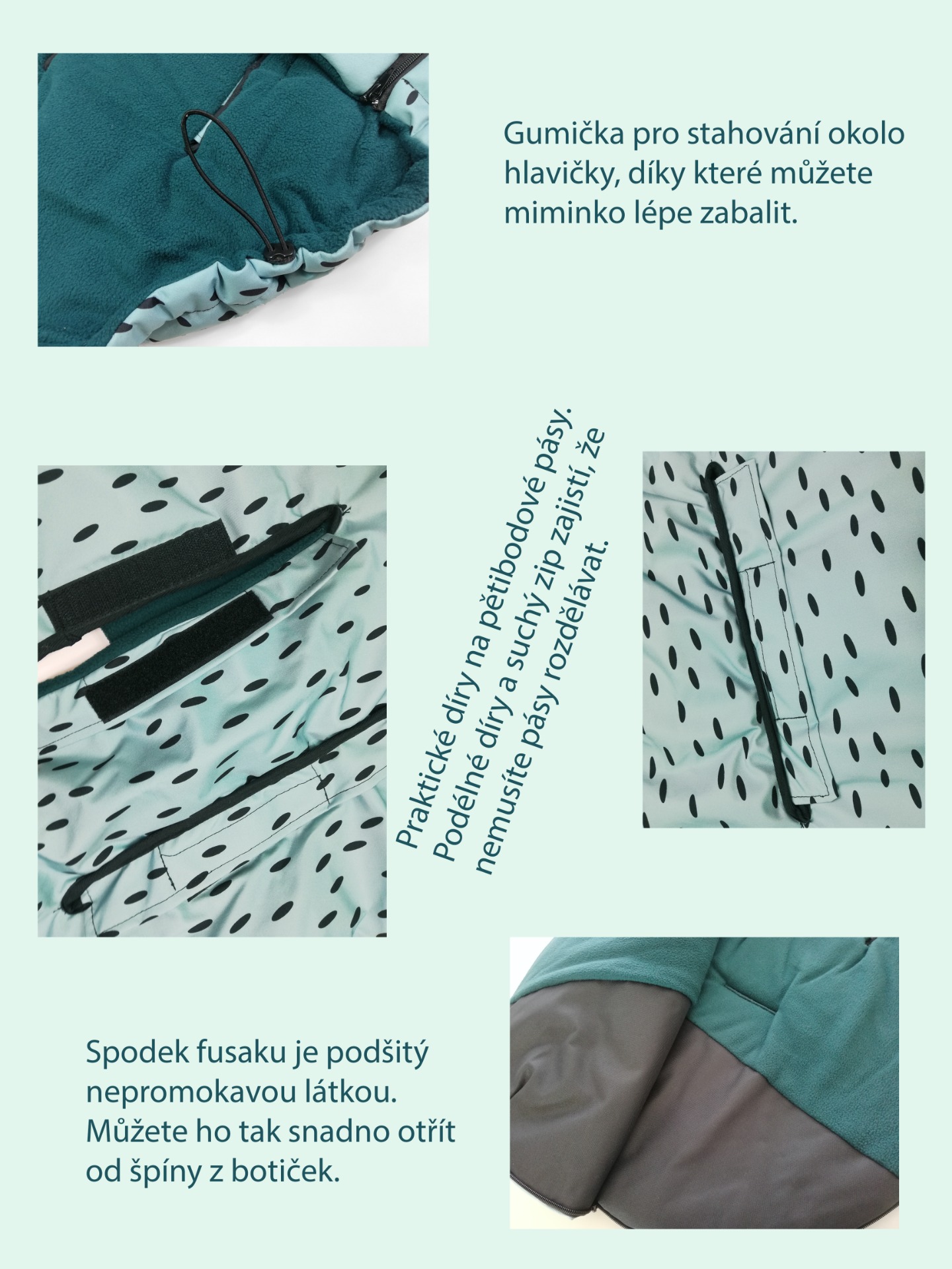 Otvory pro bezpečnostní pásy mají universální zpracování. Díky tomu je možné fusak uchytit bez nutnosti rozdělávání bezpečnostních pásů, je tak vhodný pro použití do všech kočárků s 3 i 5-ti bodovými bezpečnostními pásy.