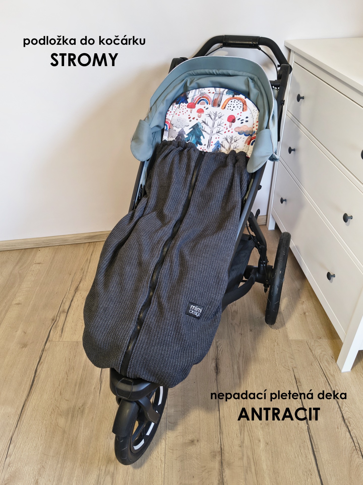 Deka má také v horní části všité gumičky s brzdičkou. Jejich utažením tak deku nahoře zmenšíte a děťátko tak můžete více zachumlat pokud zrovna fouká, prší nebo je větší zima.
