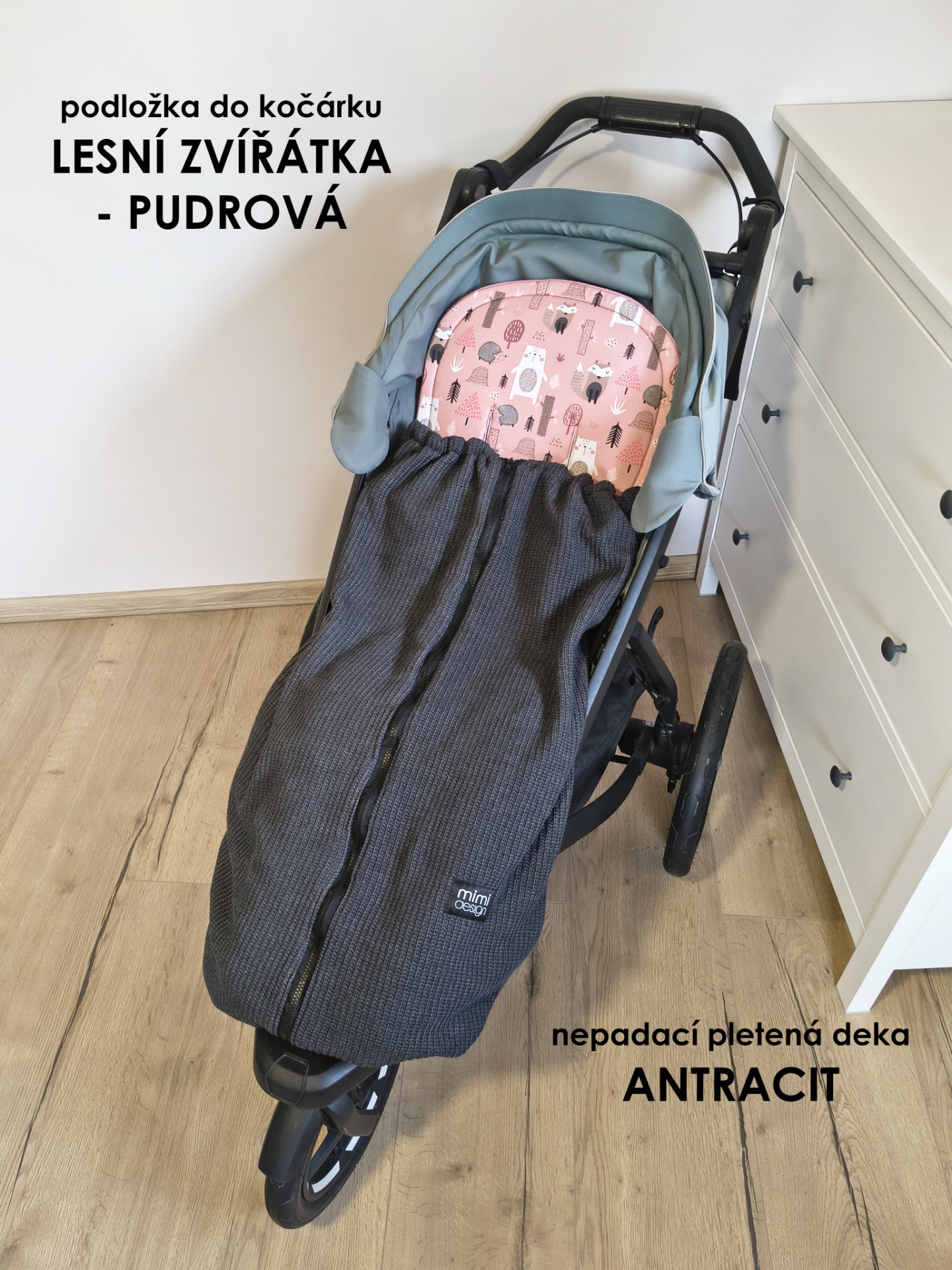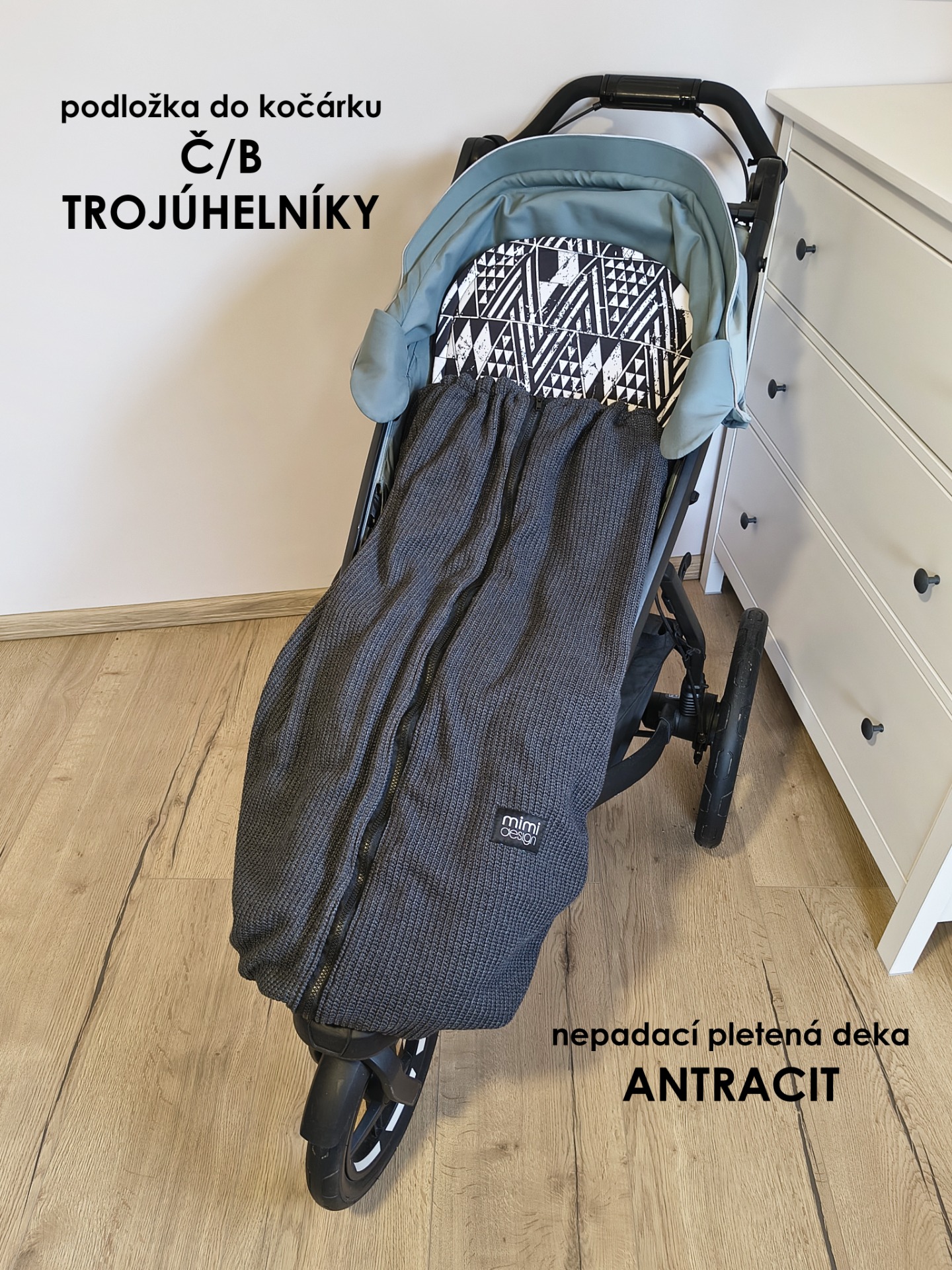 V horní části deky jsou na každé straně také všité dvě gumičky, které můžete snadno připnout ke konstrukci kočárku pomocí druku. Deku tak lze použít i bez podložky se zipy na bocích.