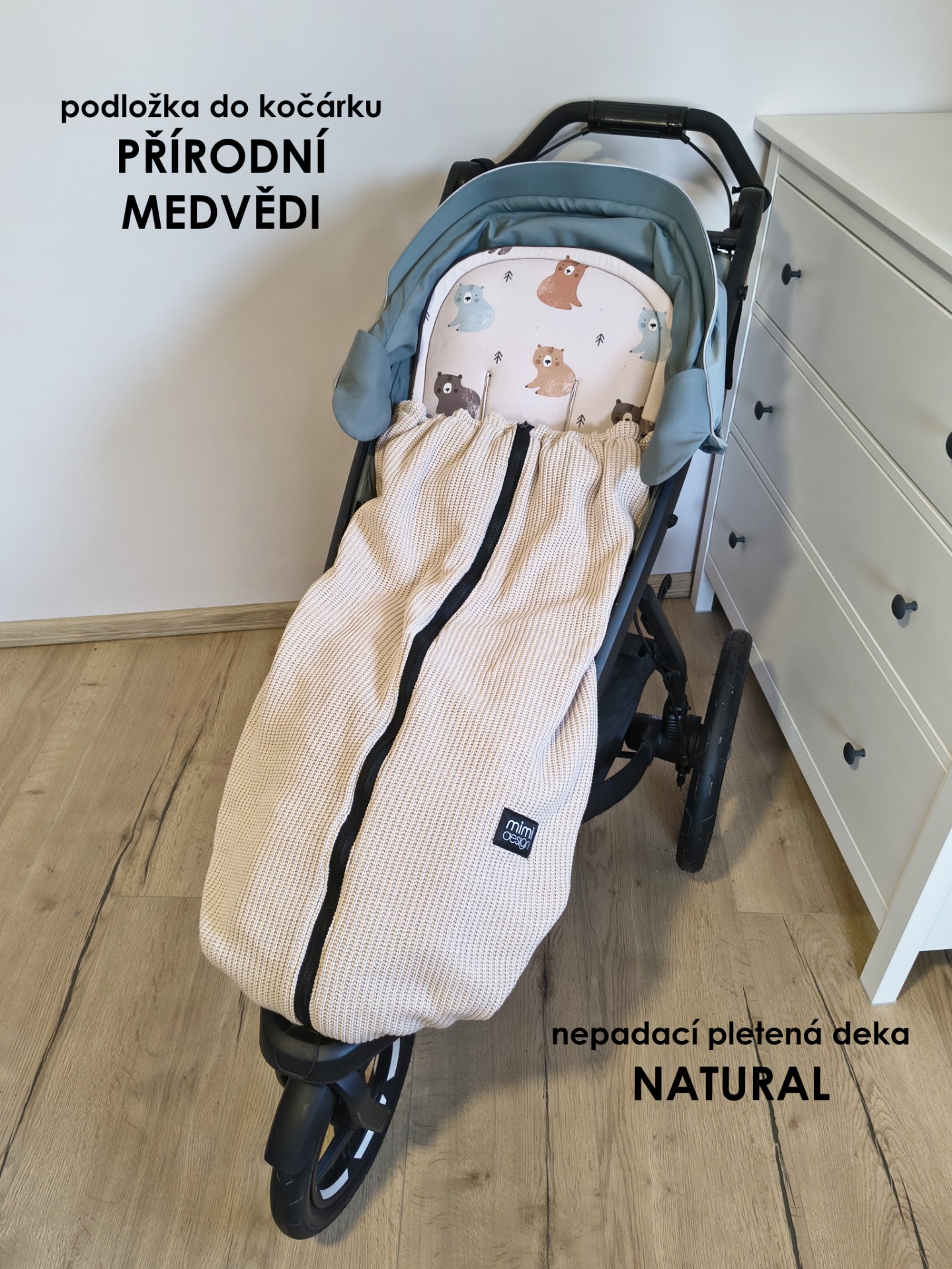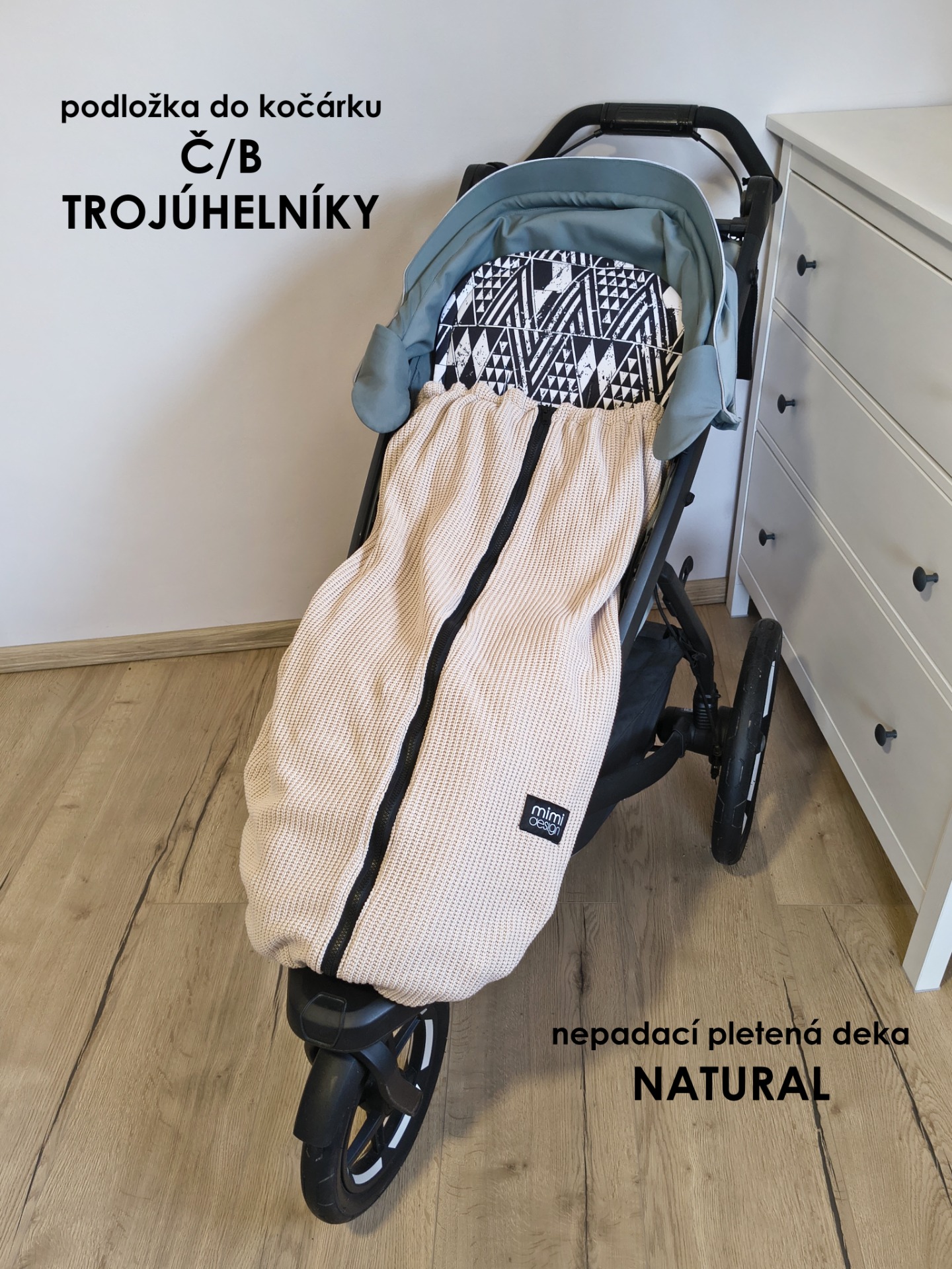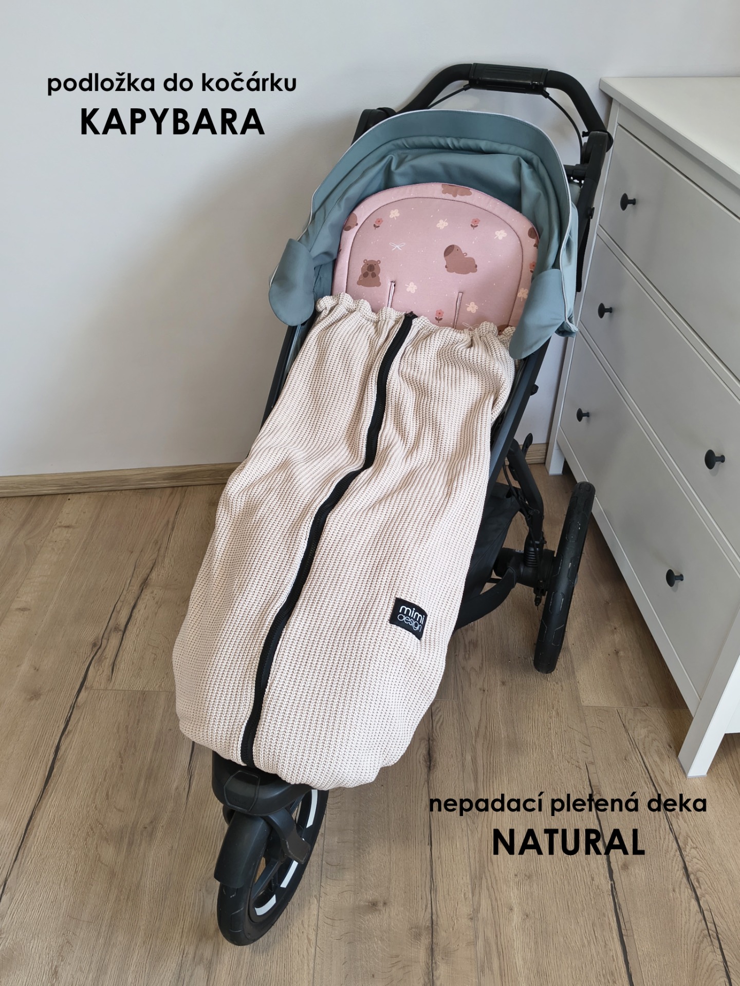 V horní části deky jsou na každé straně také všité dvě gumičky, které můžete snadno připnout ke konstrukci kočárku pomocí druku. Deku tak lze použít i bez podložky se zipy na bocích.