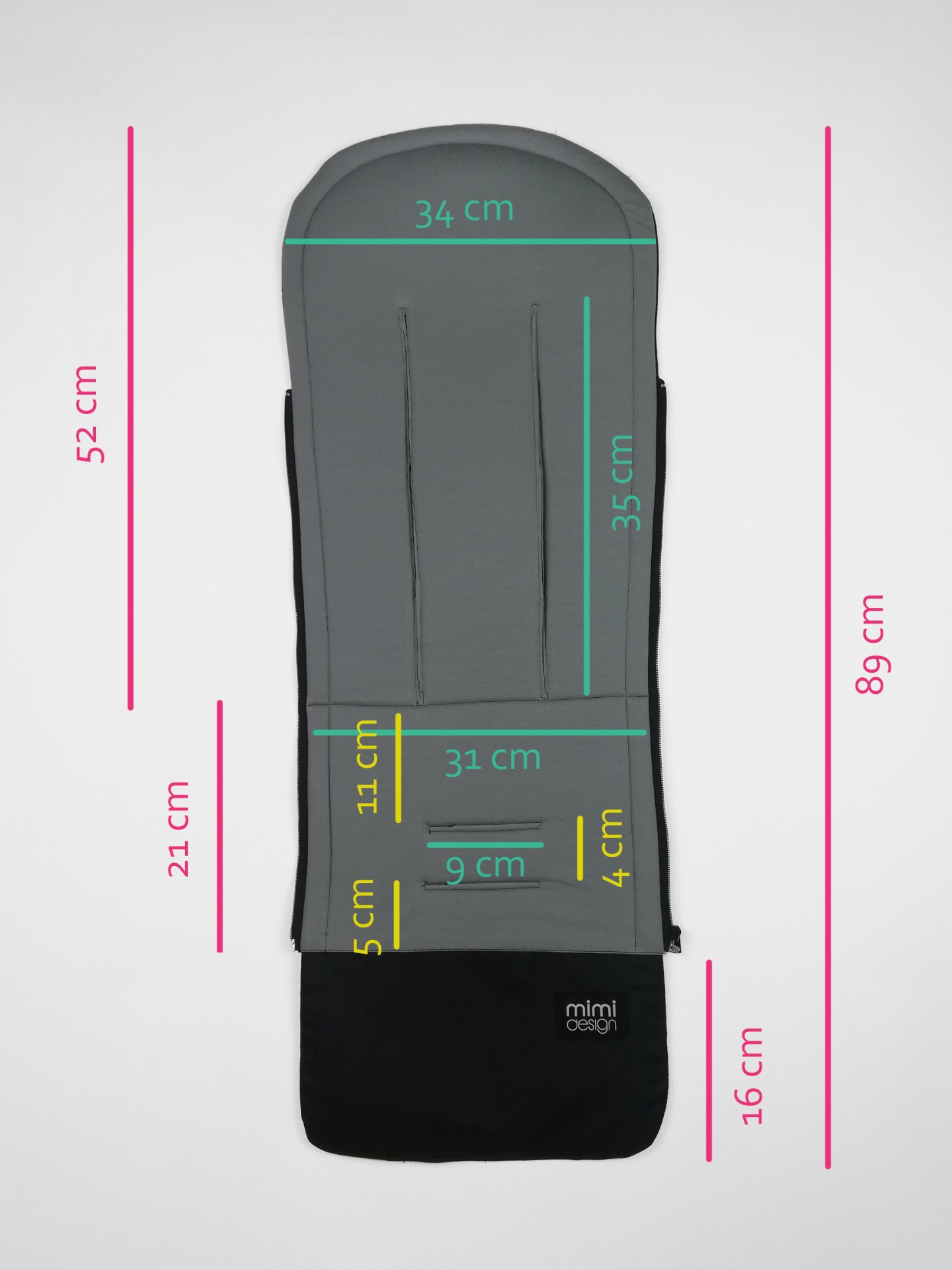Podložka má dlouhé svislé průstřihy na pásy. Aplikace do kočárku je tak velmi snadná. Velkou výhodou je také pásek, kterým pásy zafixujete. Zapnout jde vždy na zadní straně (podle toho jakou stranu vyberete) a díky tomu je naprosto neviditelný.