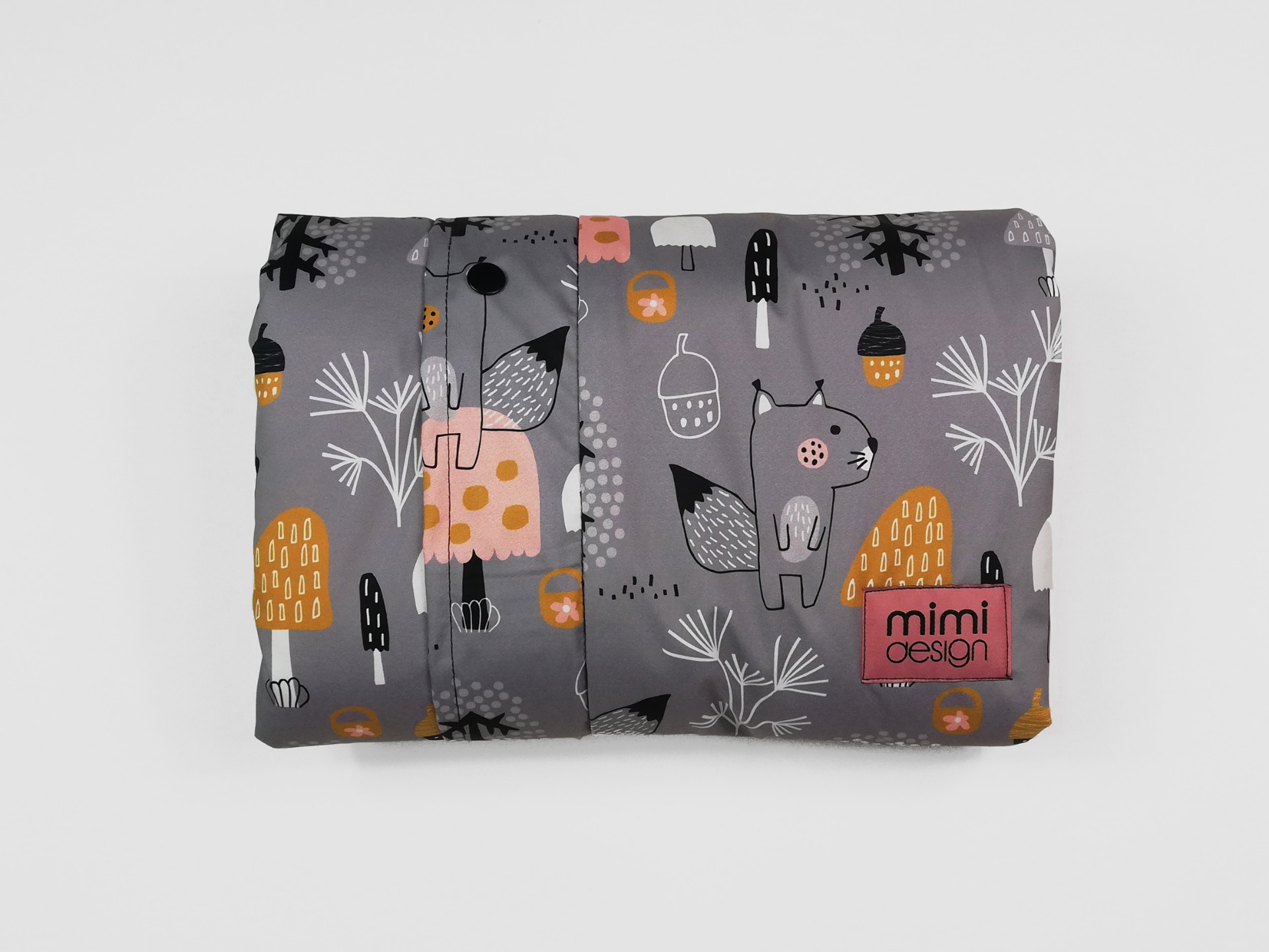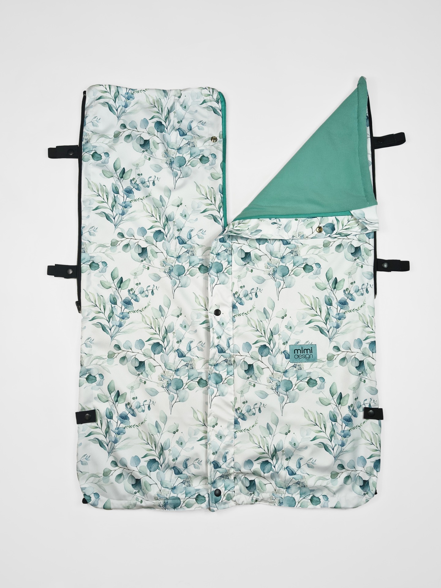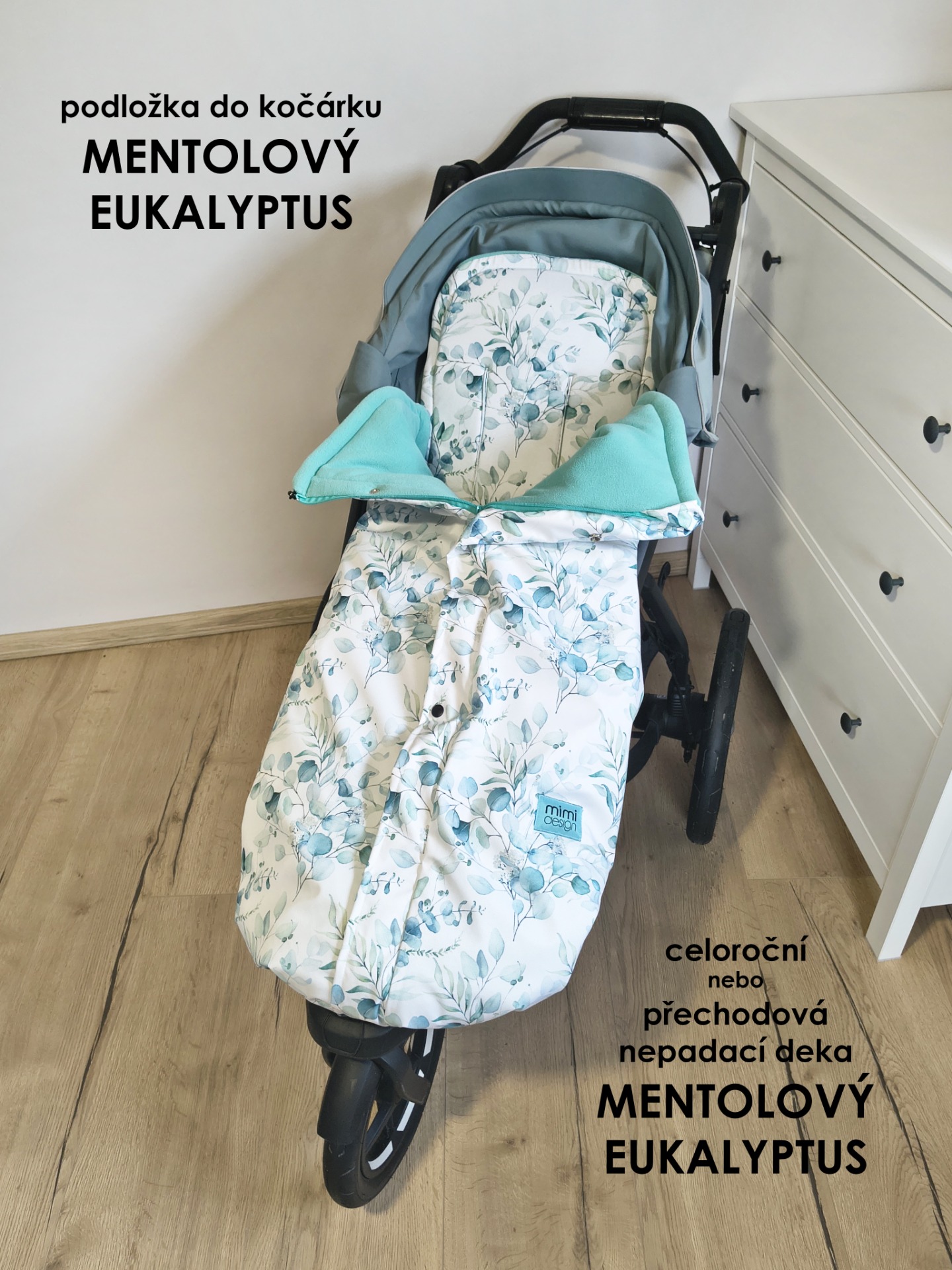 V horní části deky jsou na každé straně také všité dvě gumičky, které můžete snadno připnout ke konstrukci kočárku pomocí druku. Deku tak lze použít i bez podložky se zipy na bocích.