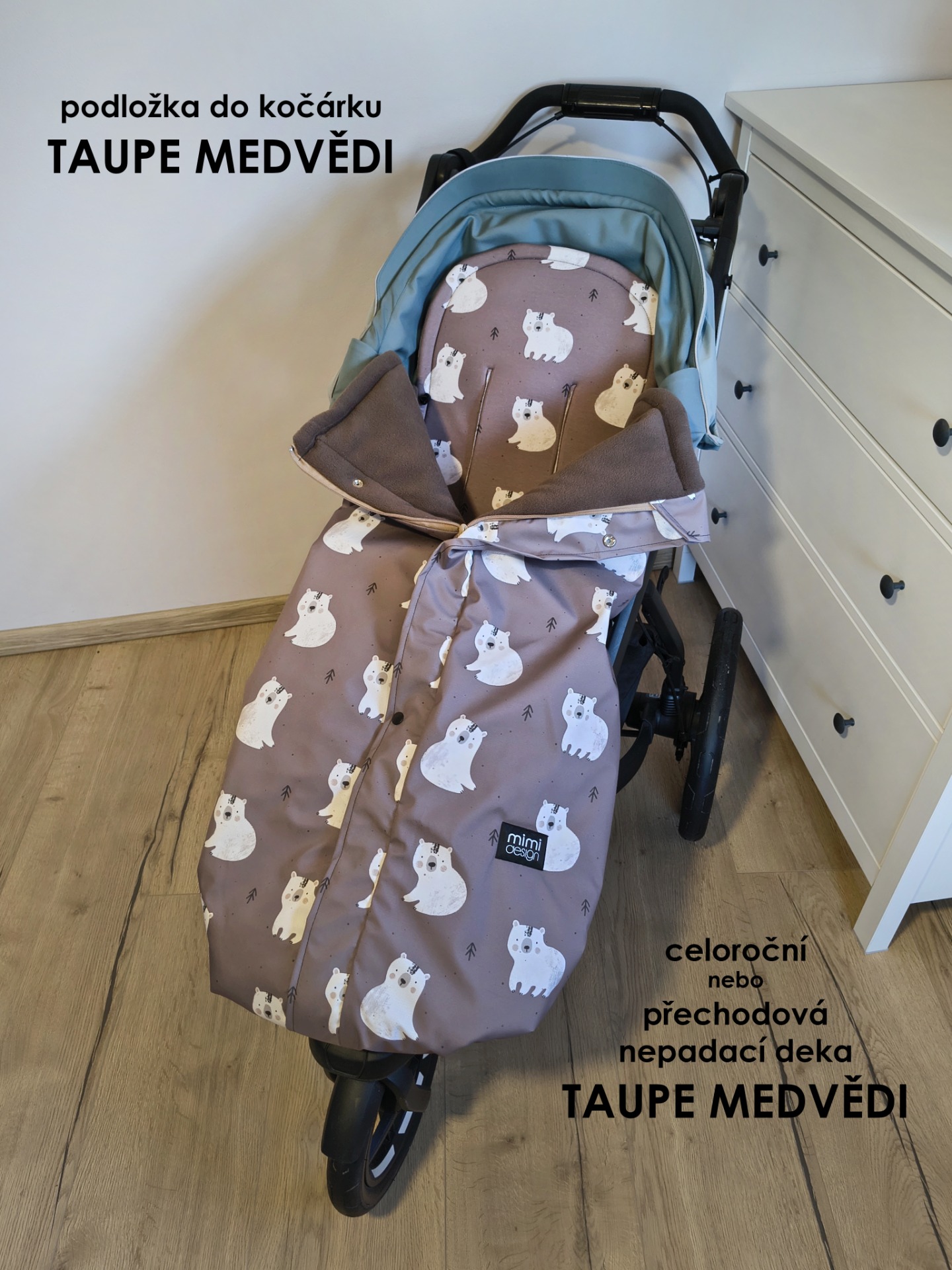 Deka je opatřena na každém boku zipem. Můžete ji tak připnout přímo k podložce do kočárku a mít jistotu, že vám deka nikdy nespadne. Také díky tomu nebude na miminko foukat a bude tak vždy v teple.