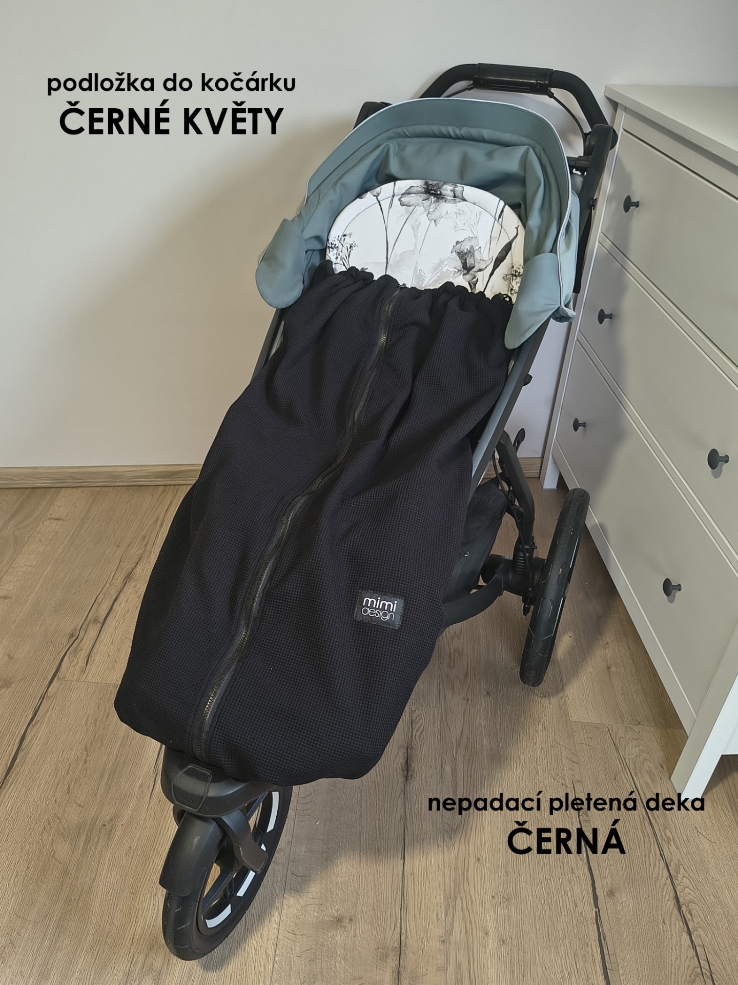 V horní části deky jsou na každé straně také všité dvě gumičky, které můžete snadno připnout ke konstrukci kočárku pomocí druku. Deku tak lze použít i bez podložky se zipy na bocích.